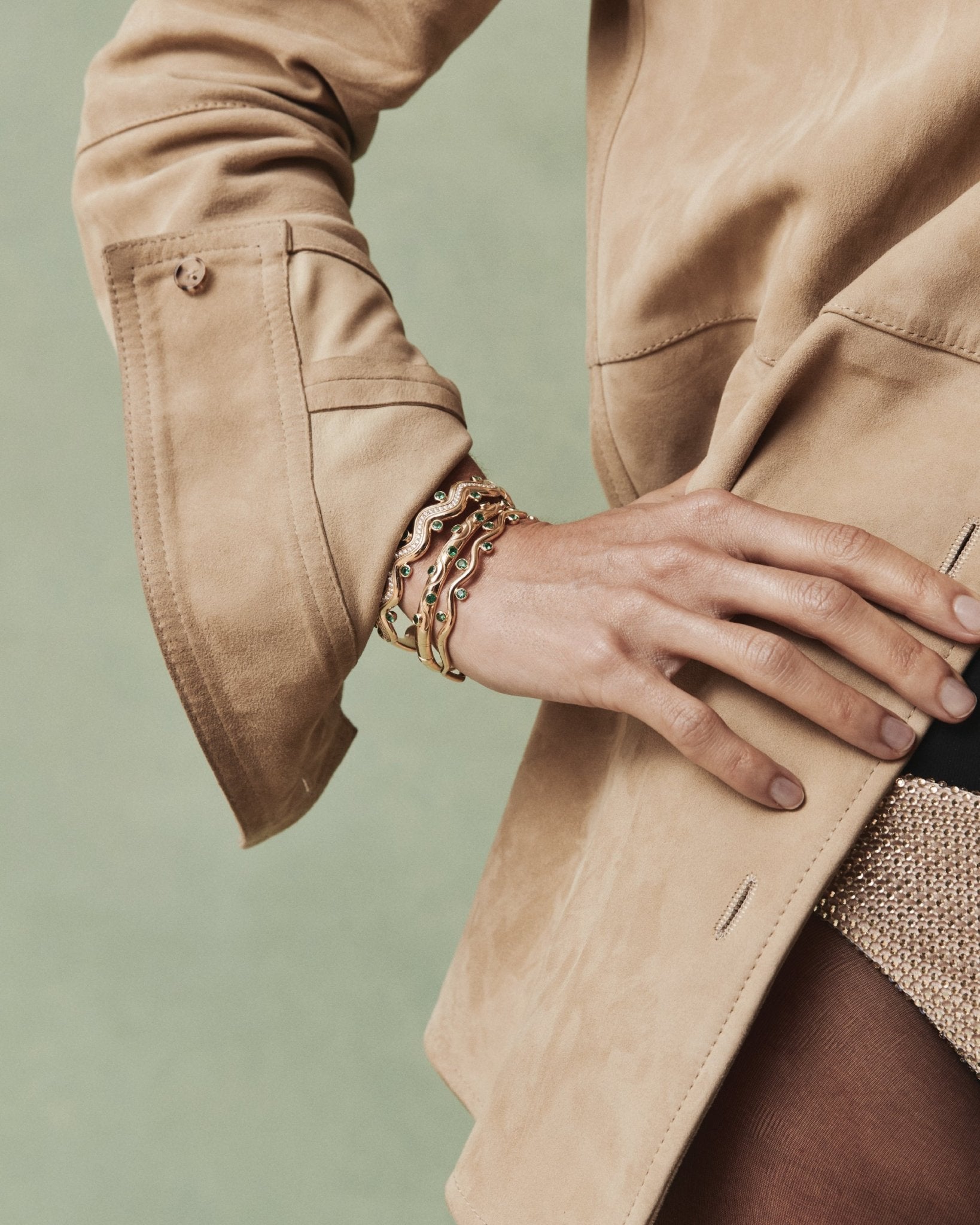 Designed to seamlessly trace the contours of the skin and move with the wearer, the Riva bangles embody fluid elegance and timeless allure.