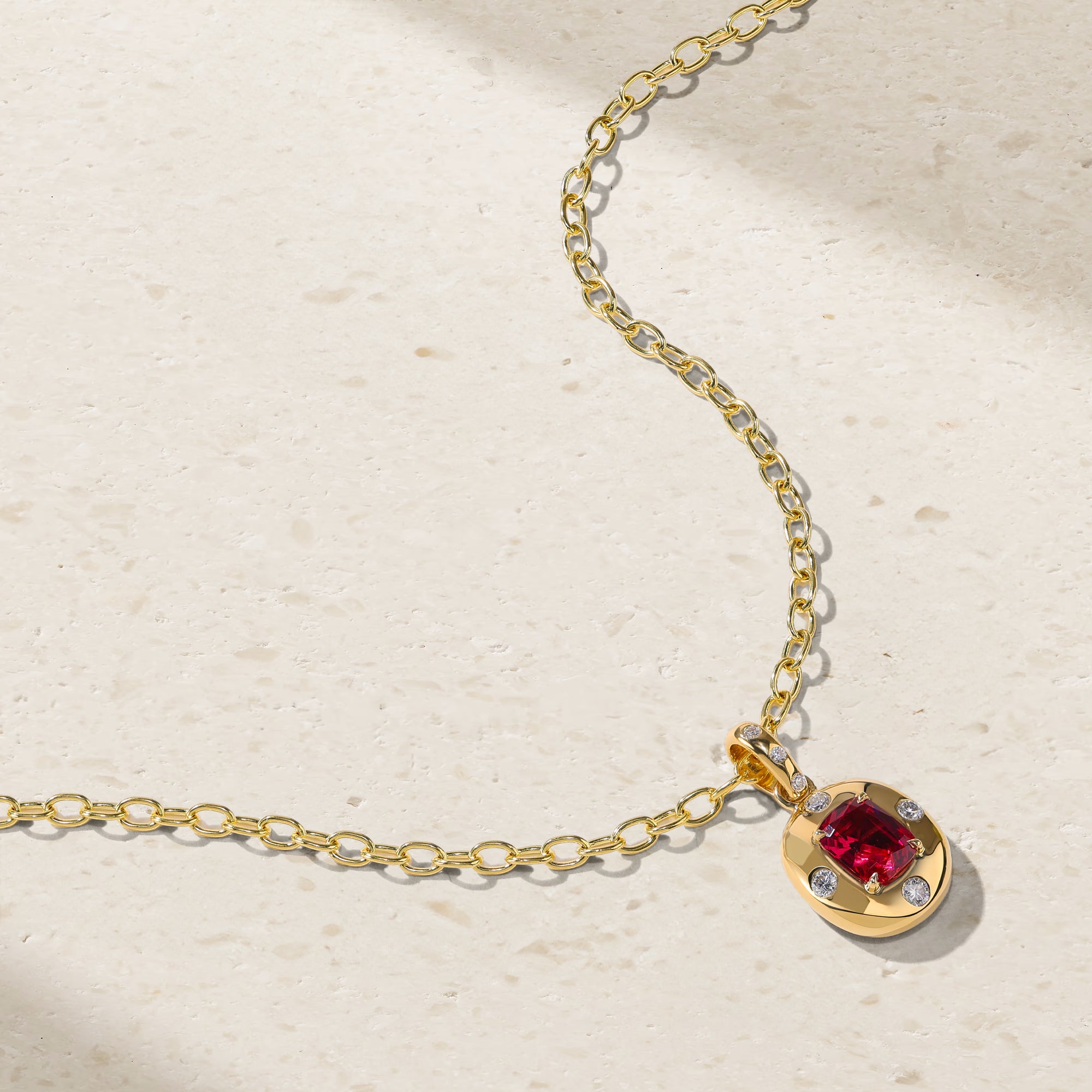 A vivid cushion-shaped red spinel glows at the heart of this striking pendant. The richly saturated gemstone is cradled in warm yellow gold and framed by a softly sculpted golden silhouette, where burnish-set diamonds are thoughtfully scattered to add subtle brilliance. Suspended from a chunky cable link chain, the design balances bold color with clean, modern lines, celebrating the natural beauty of the gemstone while embodying the effortless elegance that defines the Aurum aesthetic.