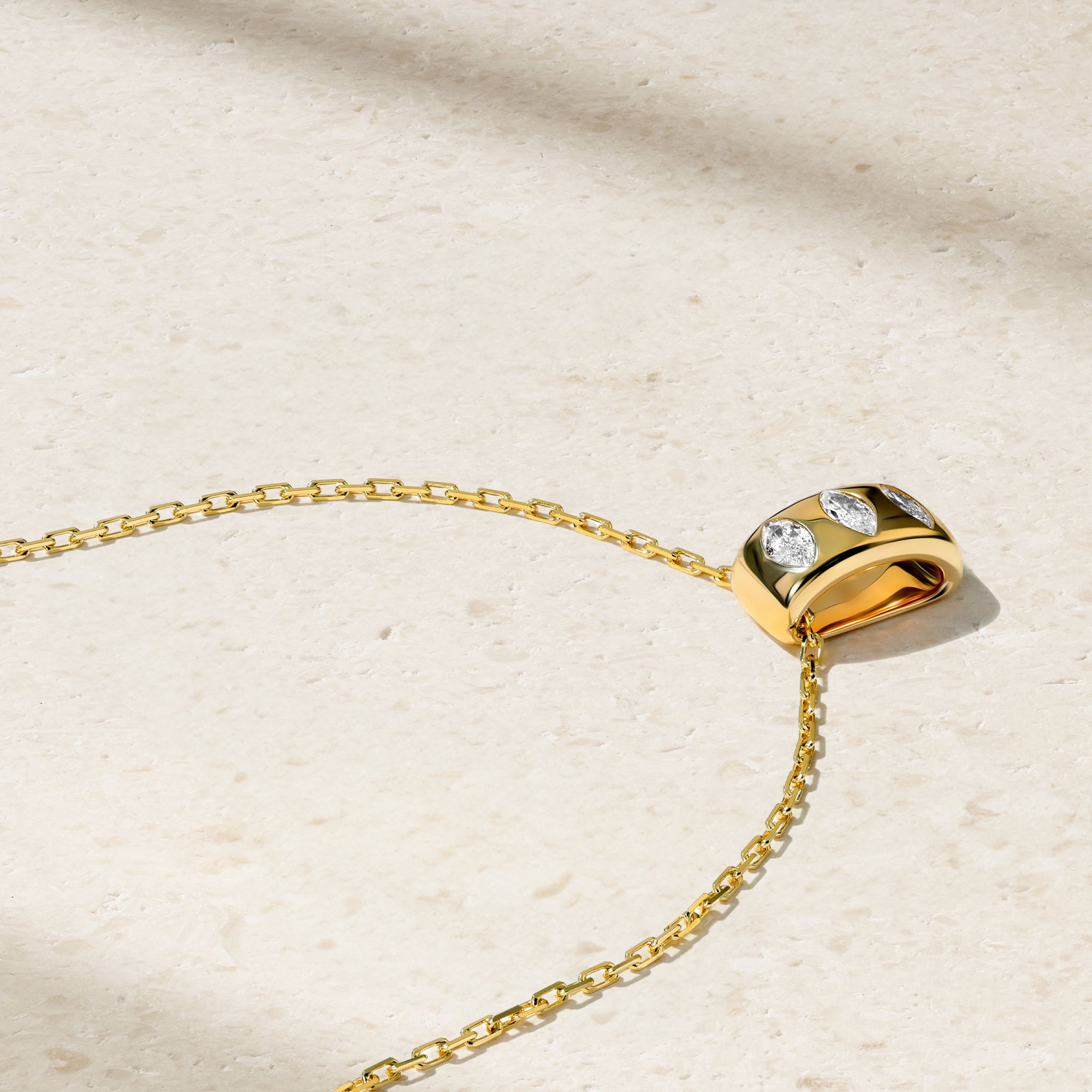 A sleek expression of protection and elegance, this pendant showcases a trio of marquise-shaped diamonds, each set within polished gold to evoke the silhouette of the timeless evil eye. The elongated shape of the diamonds lends a graceful, feminine touch, while their precise arrangement creates a sense of quiet strength and watchful presence. Suspended from a delicate chain, it’s a modern talisman designed to guard and shine. Style it solo for a subtle statement or layer it to add depth to your everyday look.