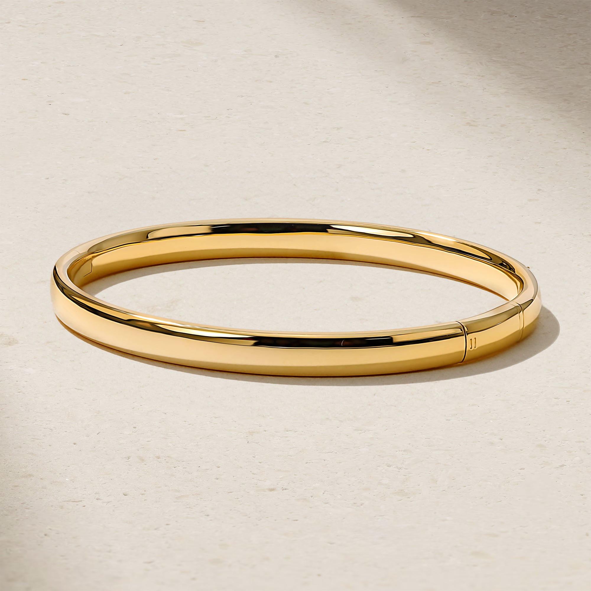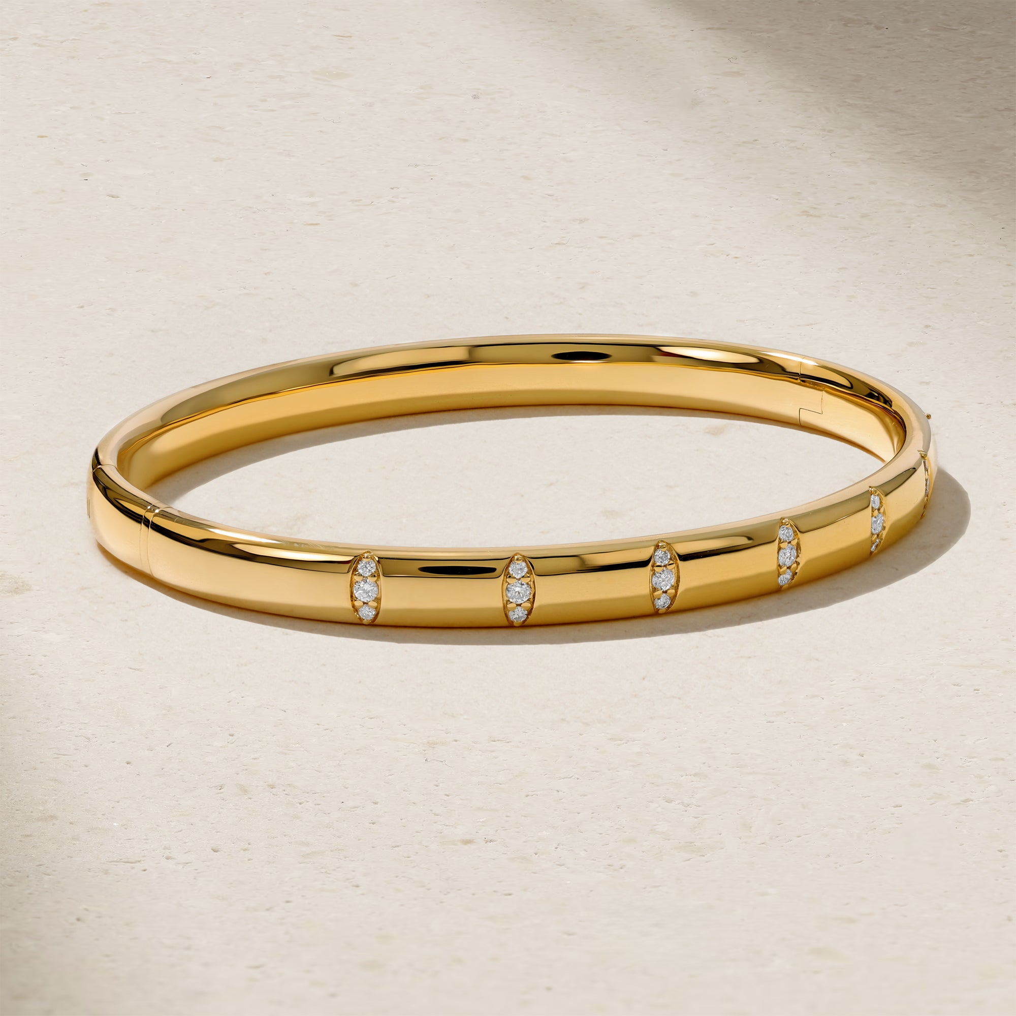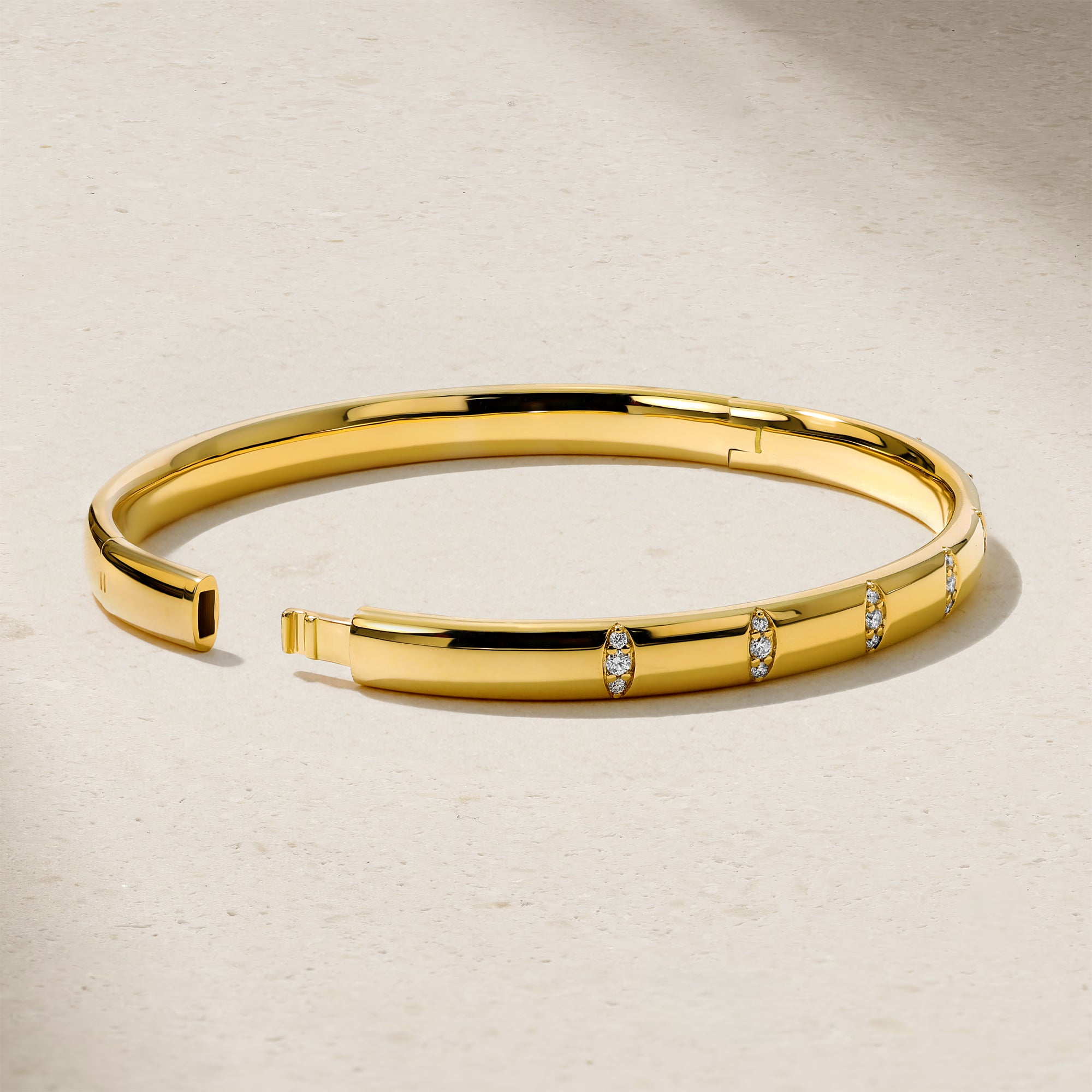 Designed as a sleek modern talisman, this bangle features a polished gold surface punctuated by repeating marquise-shaped diamond clusters, a subtle nod to the protective symbolism of the evil eye. The form is clean and sculptural, while the seamless locking mechanism ensures a smooth, uninterrupted line around the wrist. Elegant on its own or layered with intention, it’s a piece that brings meaning to minimalism.