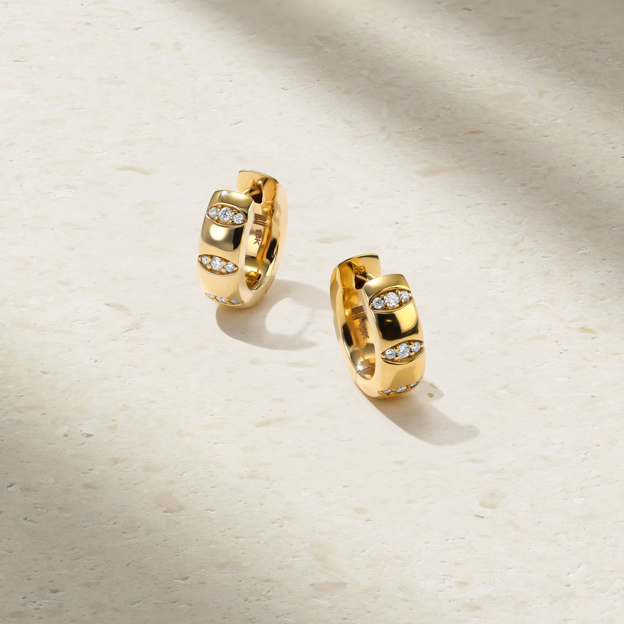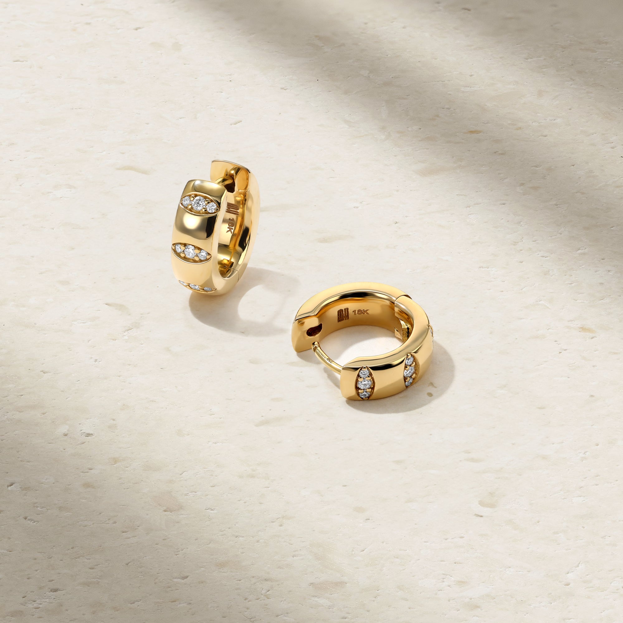 These diamond huggies channel the spirit of protection with refined elegance. Crafted in rich 18kt gold, each station features a trio of pavé-set diamonds arranged in soft, eye-like formations—an abstract nod to the ancient evil eye symbol. The design is both striking and symbolic, catching the light with every turn. Perfectly proportioned for everyday wear, they offer a subtle statement of strength and style.