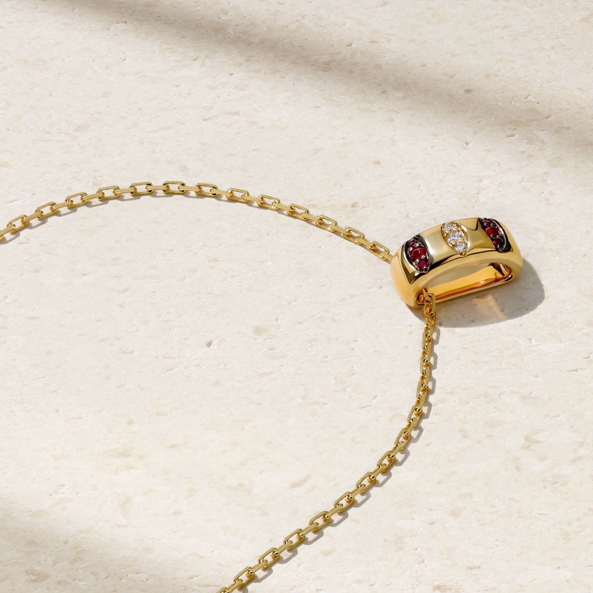 Modern and symbolic, this barrel-style pendant features alternating clusters of round rubies and diamonds, each arranged within marquise shaped gold stations that subtly echo the form of the evil eye. The fiery red rubies bring warmth and boldness, while the diamonds offer a soft brilliance that balances the design. Sleek and sculptural, it’s a meaningful everyday talisman imbued with quiet strength. Wear it solo for an elegant pop of color or layered for a look that’s more personalized to your sense of style.