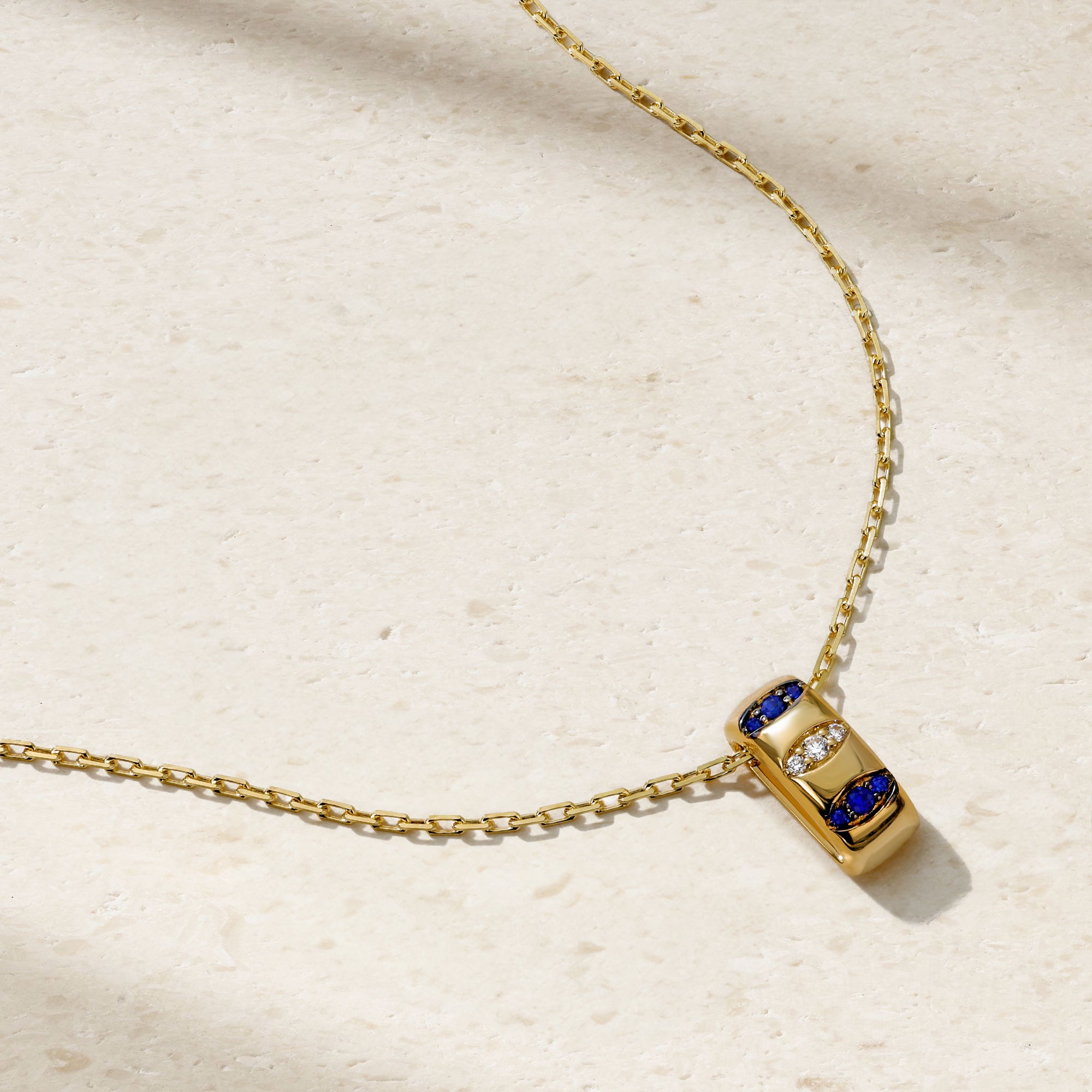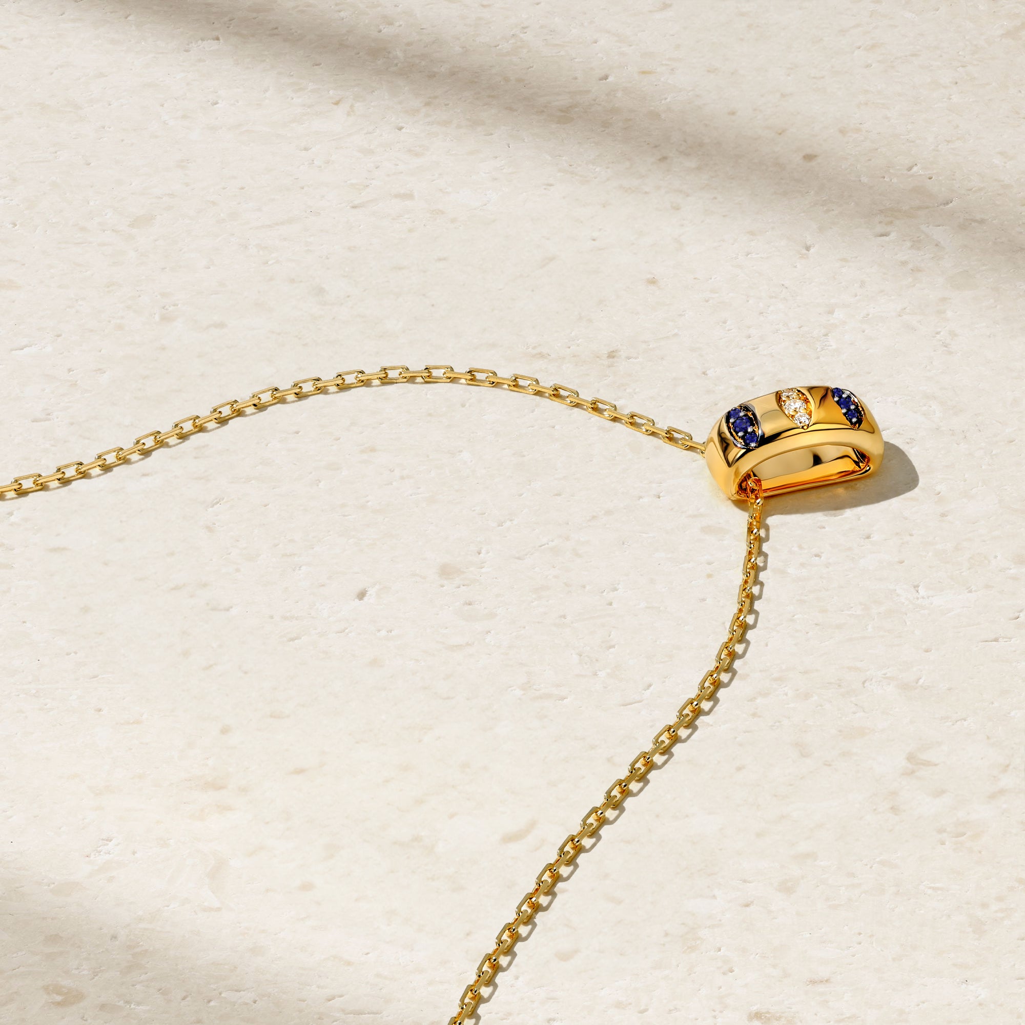 Sleek and symbolic, this polished barrel pendant features alternating clusters of round sapphires and diamonds, each set within marquise shaped gold stations that subtly reflect the form of an evil eye. The deep blue sapphires lend a sense of calm and strength, while the diamonds add a refined sparkle that enhances the pendant’s sculptural silhouette. Wear it on its own as a meaningful accent or layer it with other favorites for a look that's timeless and deeply personal.