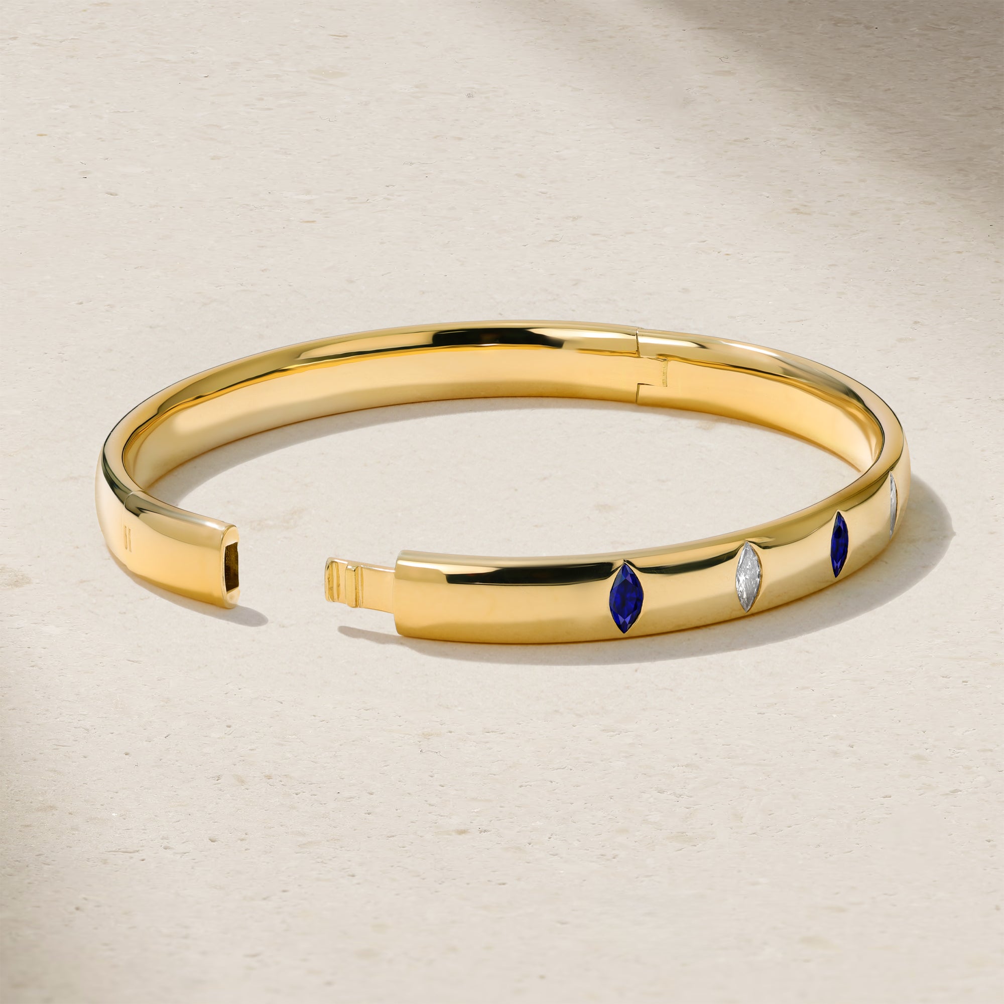 Elegant and quietly symbolic, this bangle features alternating marquise cut sapphires and diamonds set into a sleek, high polish gold surface. The elongated stones subtly reference the protective form of the evil eye, offering both beauty and meaning in equal measure. Designed with a seamless locking mechanism for a smooth, comfortable fit, it’s a refined talisman you’ll reach for daily. Wear it solo for understated elegance or stack it with other gemstone bangles for a look layered with color and intention.