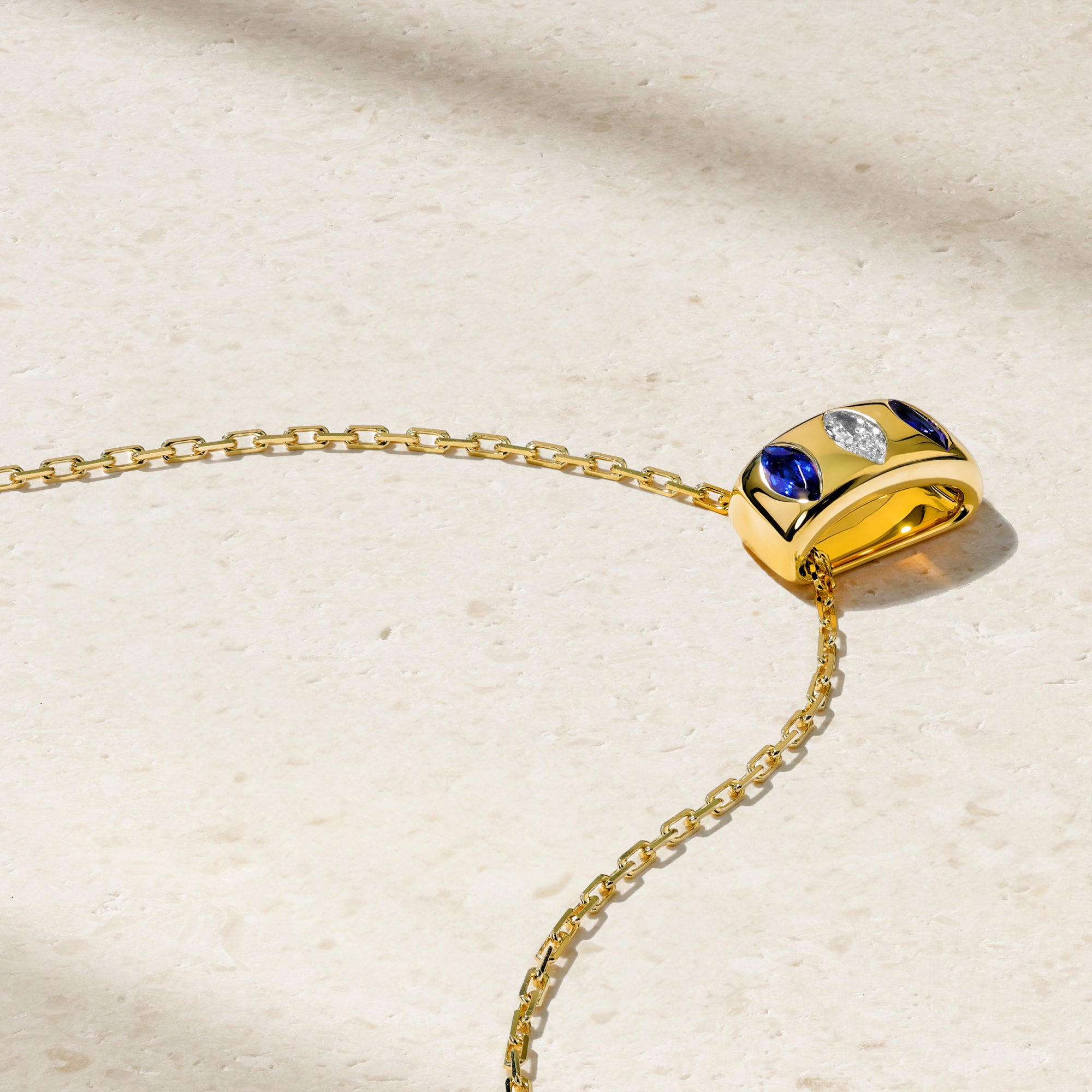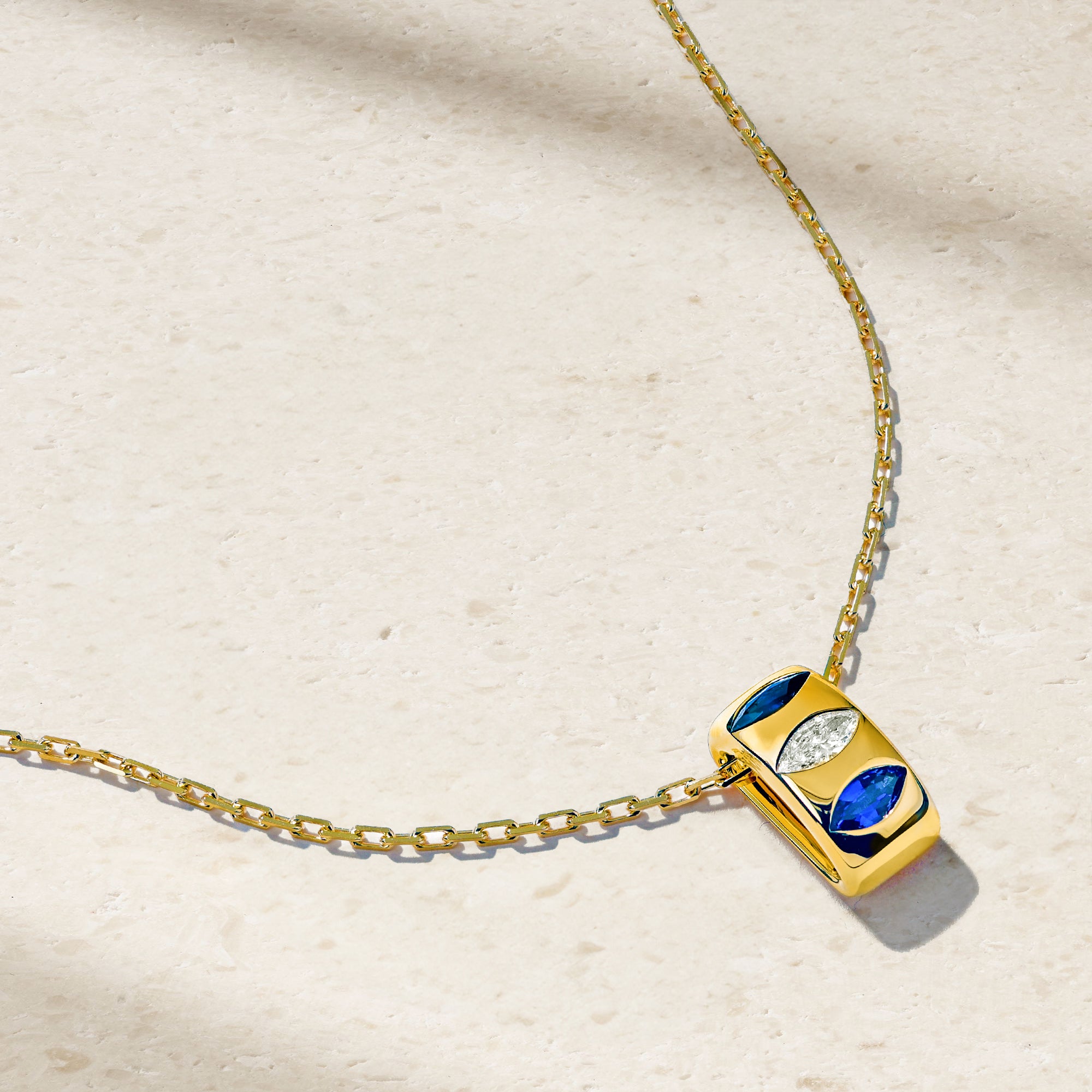 This elegant pendant centers on a brilliant marquise-cut diamond, flanked by two richly saturated sapphires in matching sculptural settings. The eye-like silhouette nods to ancient symbols of protection, reinterpreted here with a modern sensibility and timeless appeal. The vivid contrast of blue and white creates a quietly powerful statement—one that feels both personal and refined. Wear it alone as a meaningful talisman or layered for an added touch of color and intrigue.