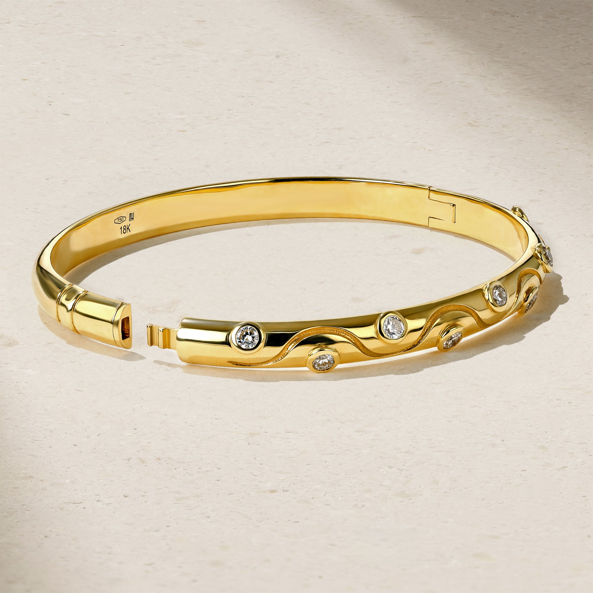 Inspired by the graceful rhythm of moving water, this bangle features a bold, high-polish gold form sculpted with undulating waves that ripple across its surface. Bezel set diamonds are nestled along each crest, catching the light in a sequence of gentle brilliance. The curvature of the gold creates a dynamic interplay of shine and shadow, giving this piece both presence and poise. Designed to make an elegant statement on its own or layer seamlessly with other favorites, it’s a refined expression of movement, light, and modern luxury.