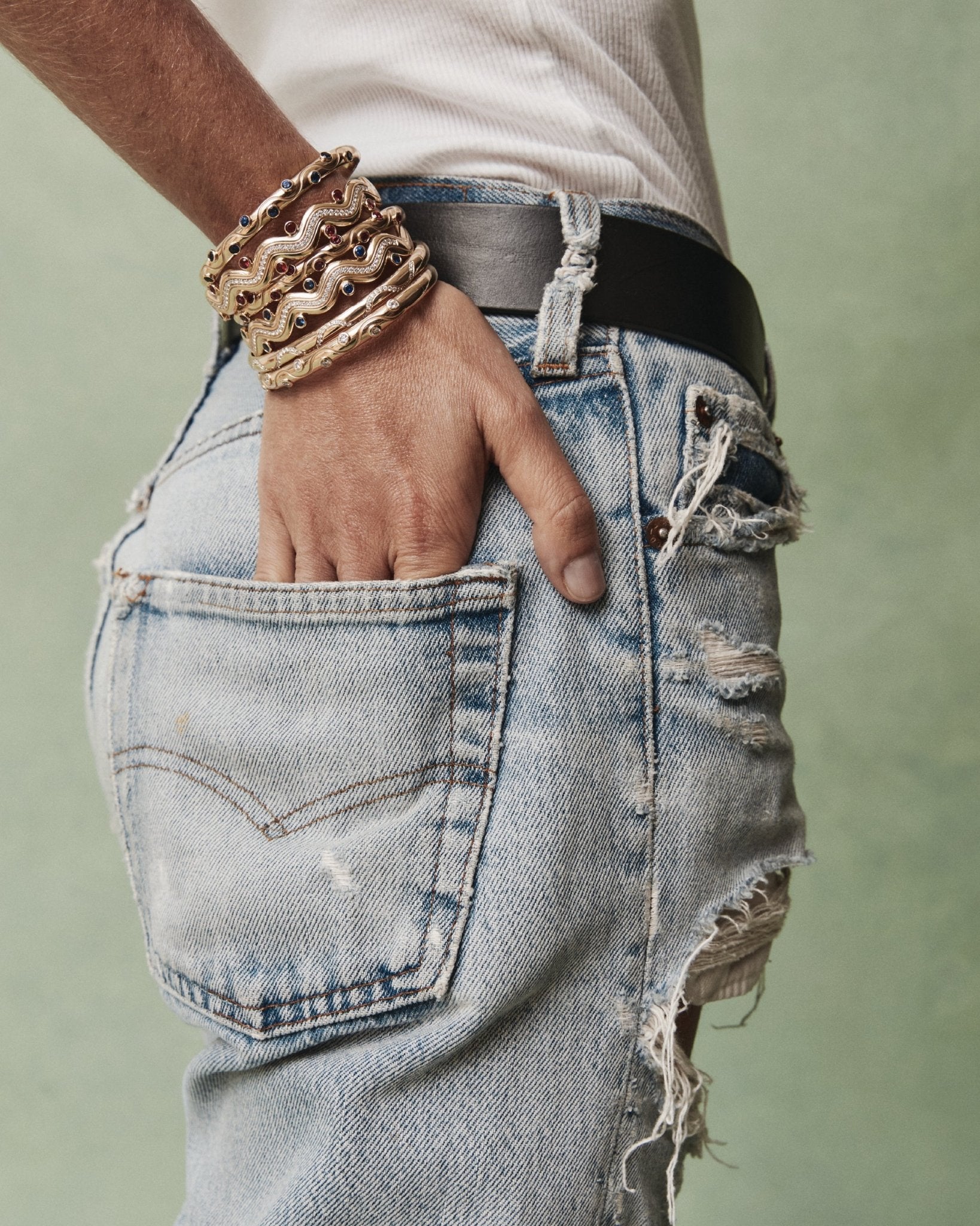Leandra wears the Riva bangles in an effortless stack, a bold expression of individuality and grace. Layered together, they create a sculptural rhythm of light and movement; worn alone, each piece becomes a singular statement, refined and enduring.