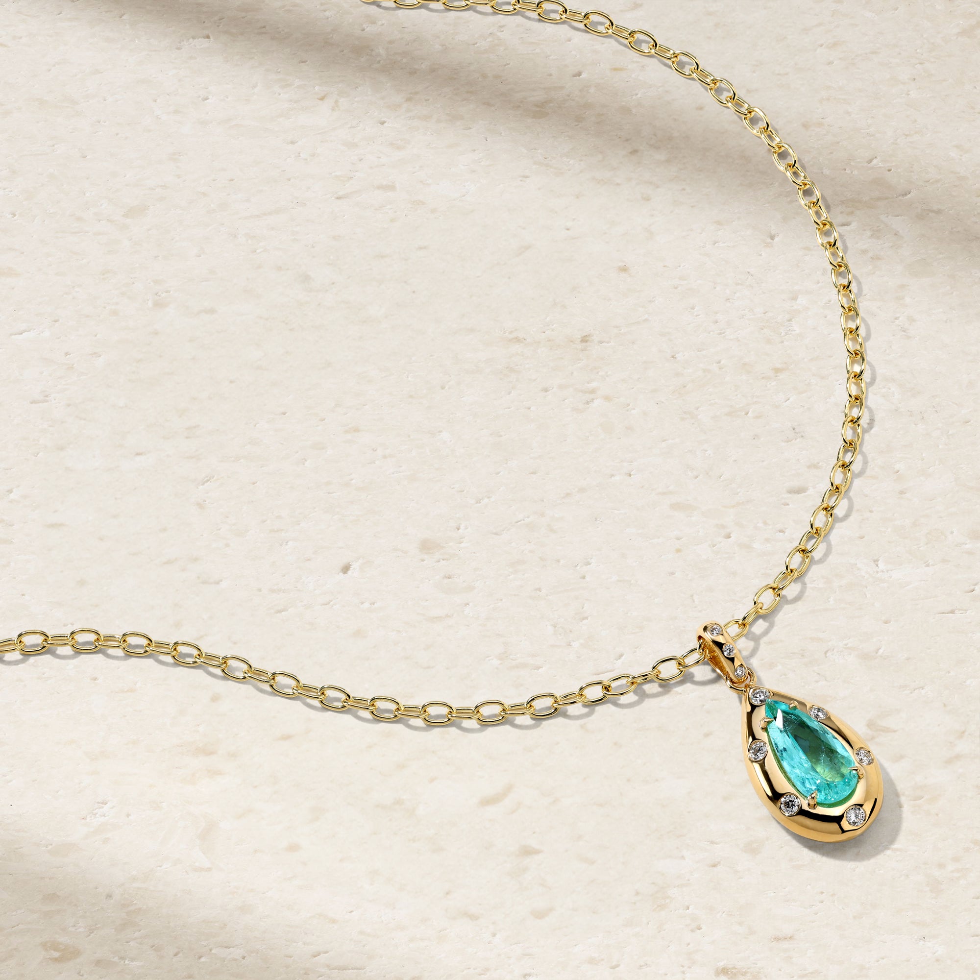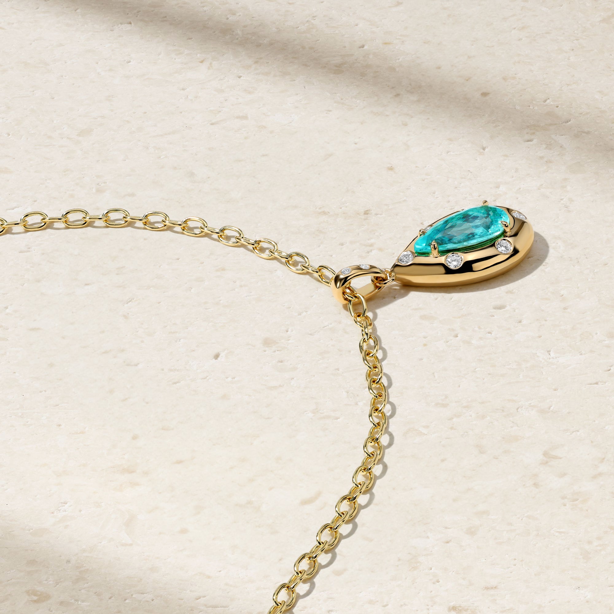 A vivid pear-shaped Paraiba tourmaline takes center stage in this striking pendant, its electric blue-green hue glowing against a sculptural frame of polished yellow gold. The gemstone is embraced by a fluid golden silhouette, punctuated by burnish-set diamonds that sparkle subtly along the perimeter, adding delicate brilliance without overwhelming the vibrant center stone. Suspended from a fancy cable link chain, the design balances bold color with modern elegance—an effortless statement piece that brings a luminous pop of color to both everyday wear and evening attire.