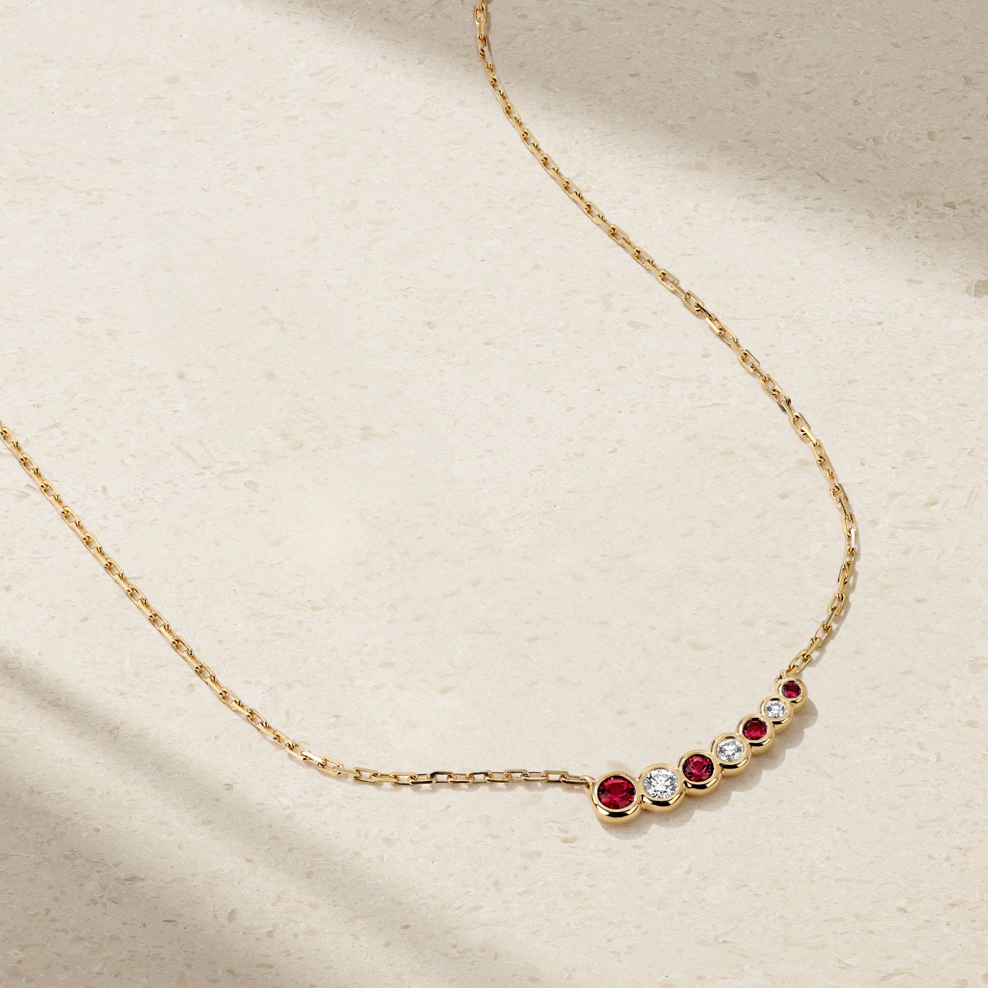 Simple, elegant and versatile, this slightly curved necklace is the perfect piece for every day. It's set with a row of vivid rubies and twinkling diamonds all resting in pillowy, bezel frames. Wear yours solo or layered with other equally dainty styles for a more personalized look.