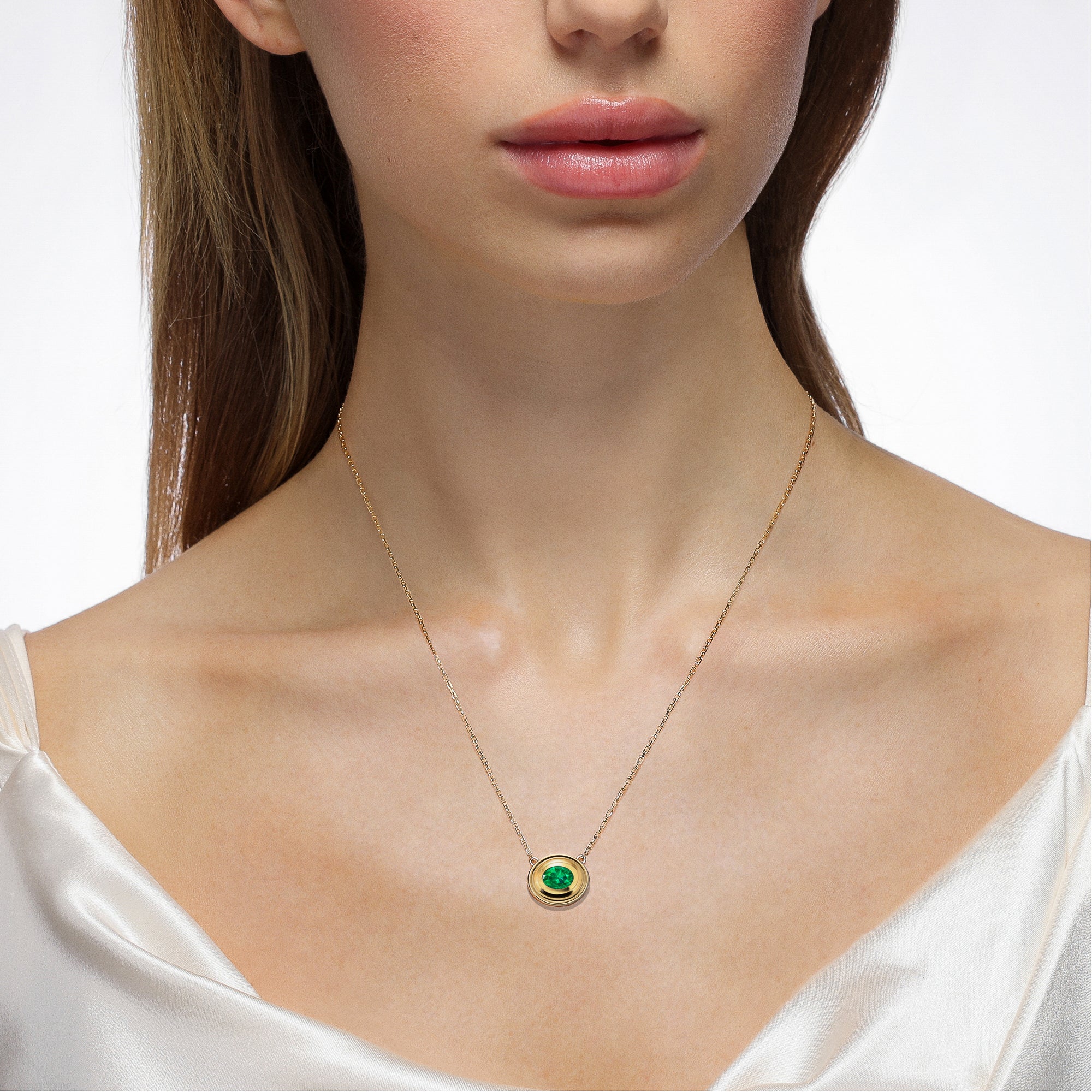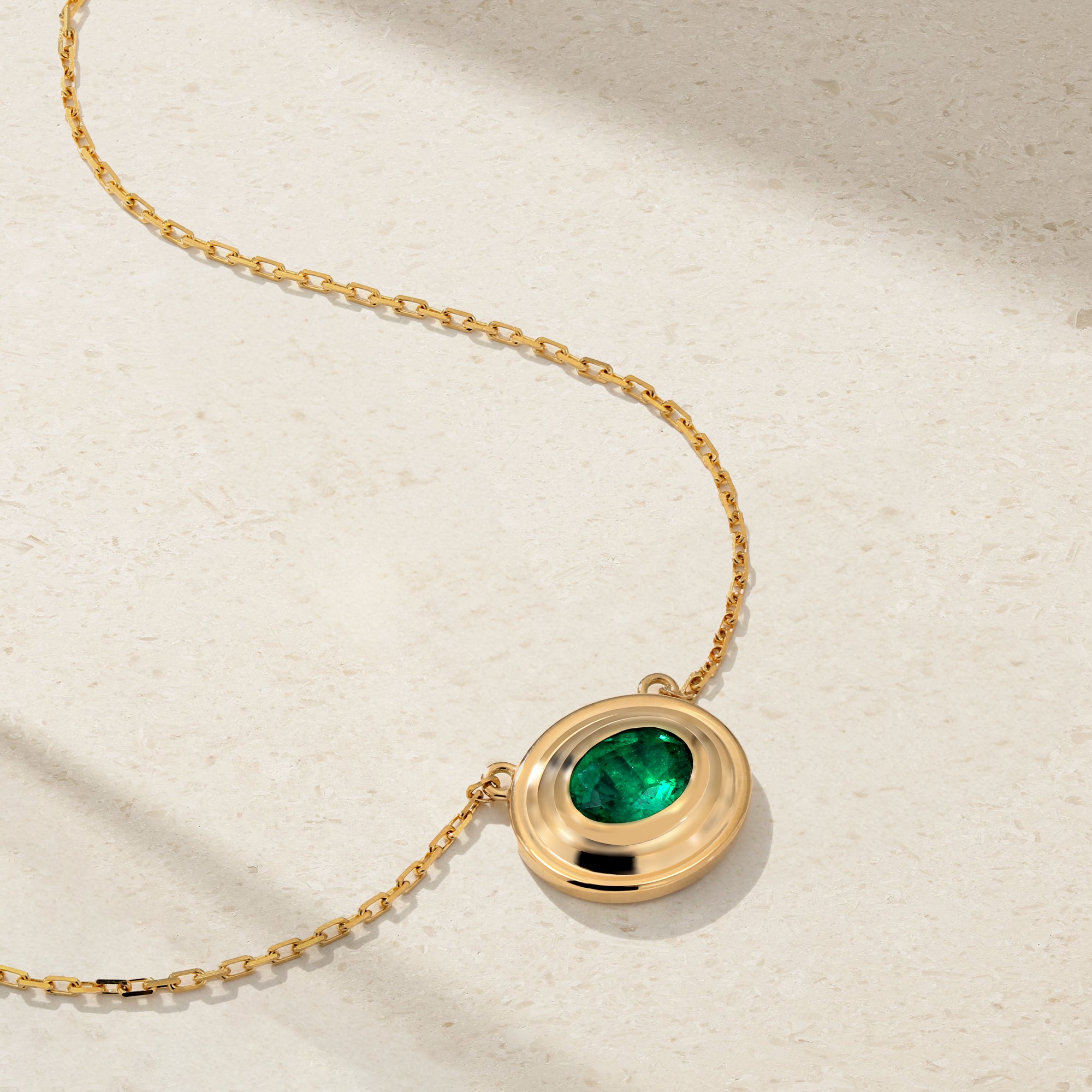 A timeless option for everyday wear, this necklace showcases a stunning oval shape emerald resting securely within a tiered bezel design. It is suspended from a delicate 18" cable link chain that can be worn at two different lengths for styling versatility. Wear it on its own or layer it together with other necklaces for a more personalized appearance.
