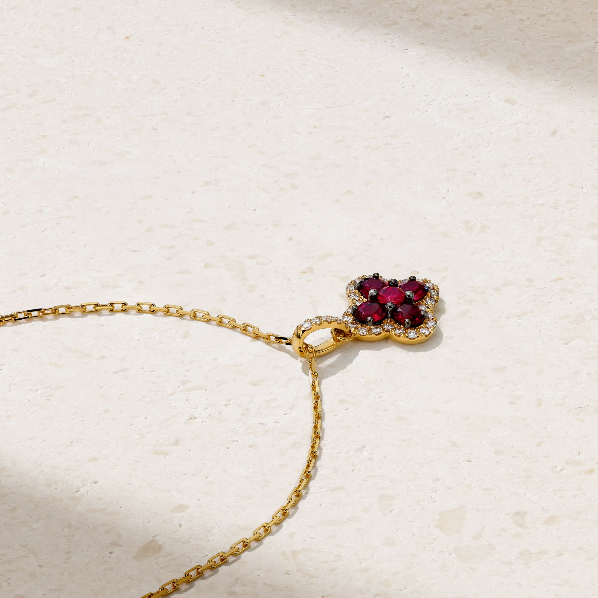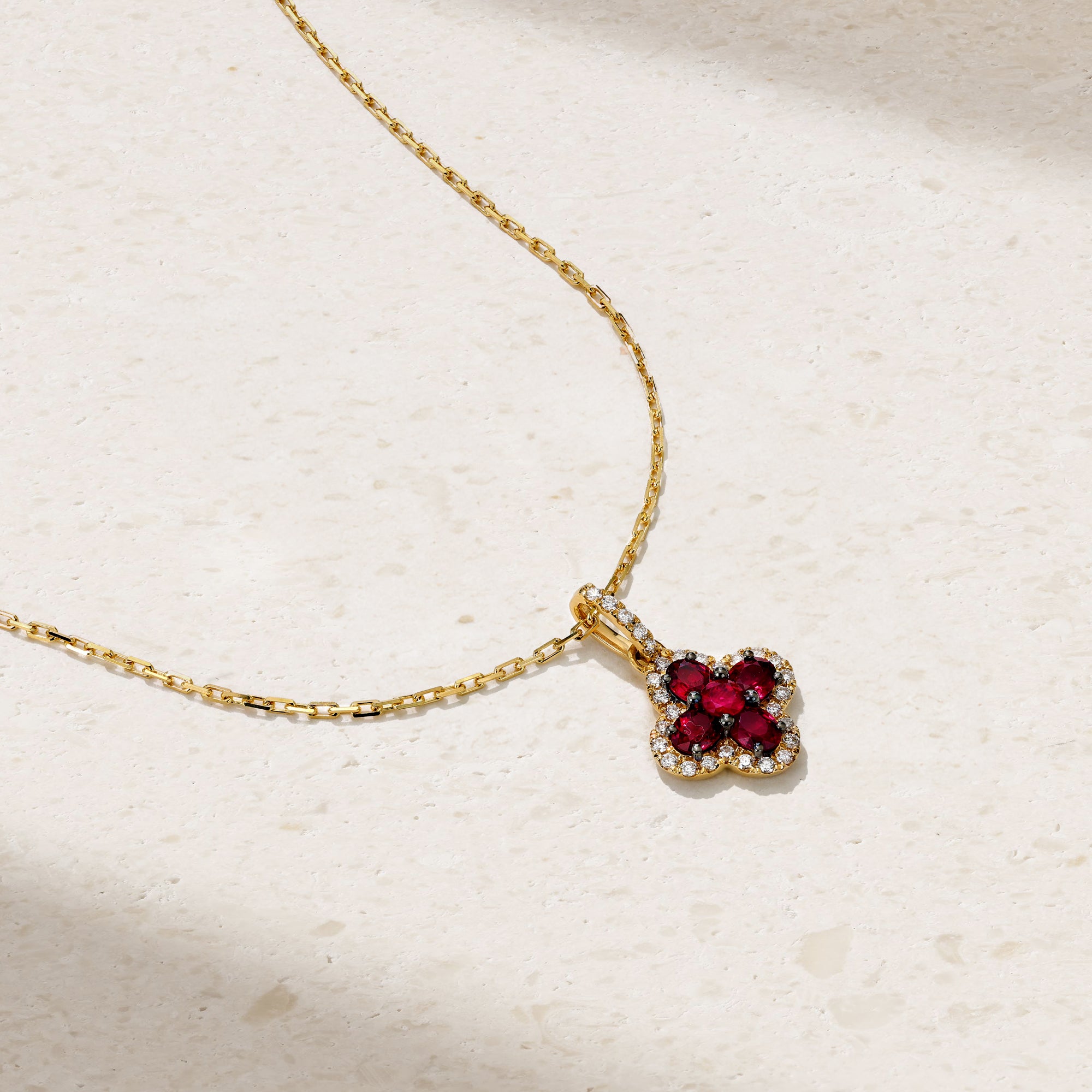 A quartet of vibrant rubies are arranged in a classic clover-like formation while petite diamonds frame the silhouette to add a touch of sparkle. A larger round ruby rests at the center of the four ovals, lending a blended effect that gives a bolder statement. It is suspended from a beautiful cable link chain that can be worn at various lengths for versatility. We love the dramatic appearance for its ability to elevate any look with its understated elegance.