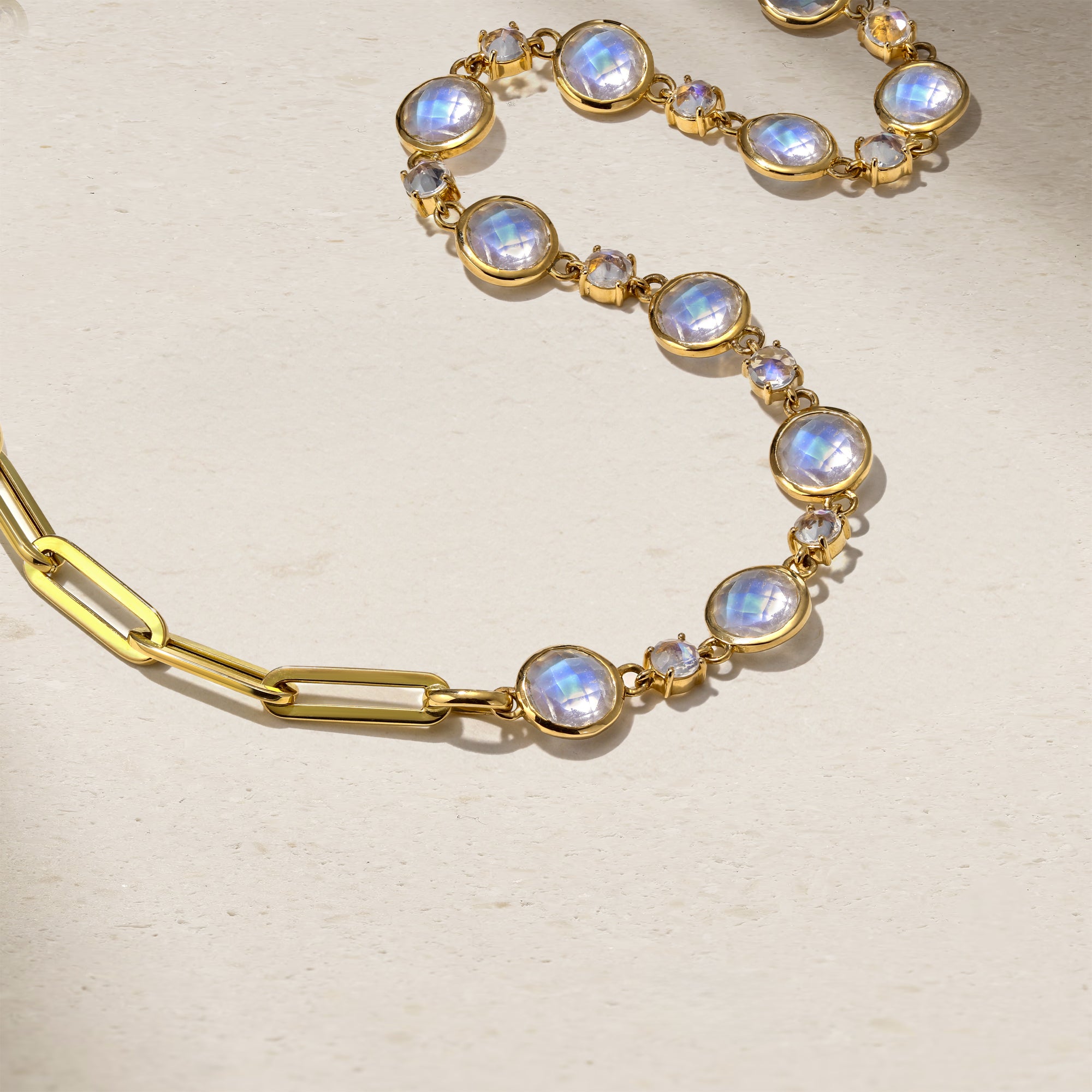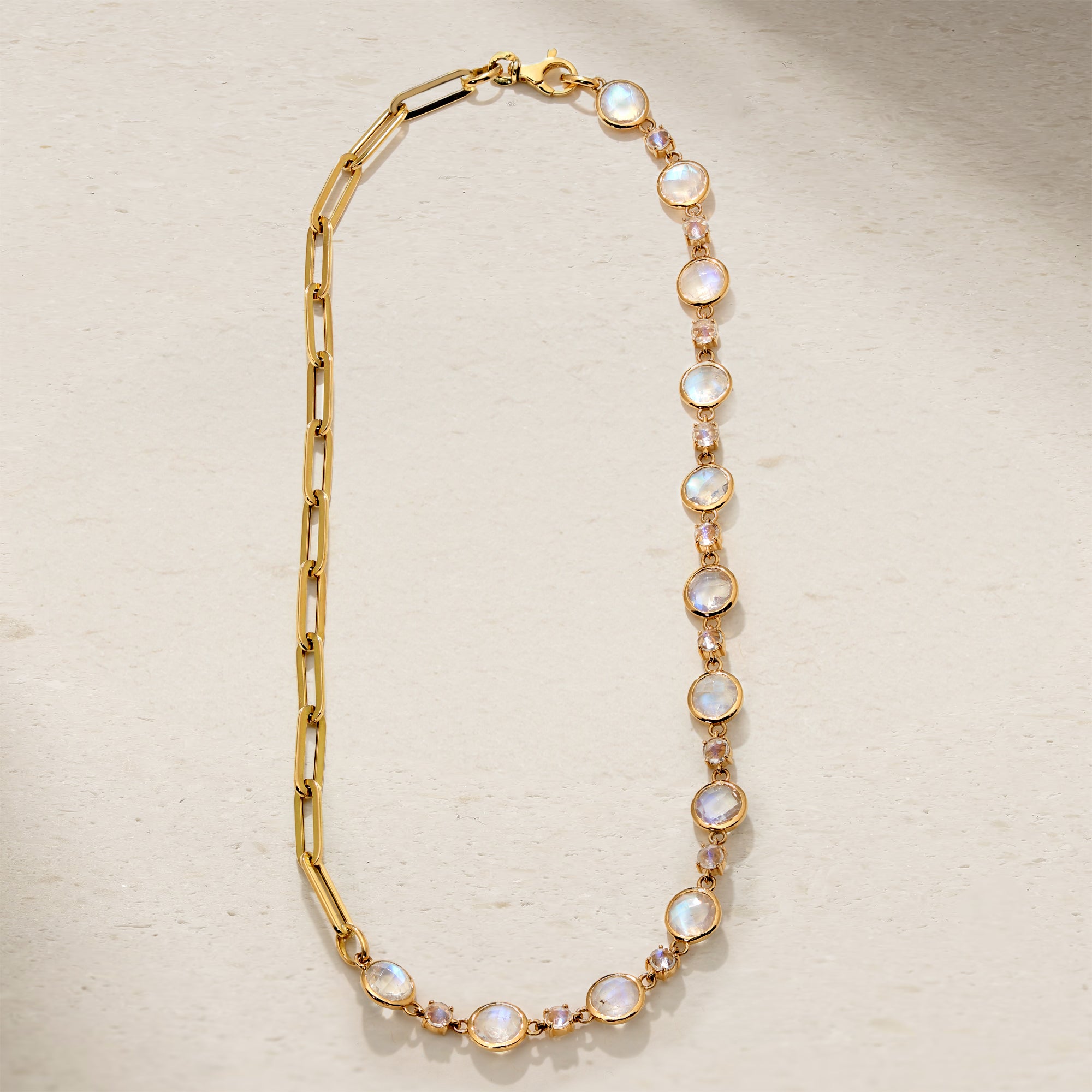 This striking and versatile piece is strung with a beautiful assortment of glowing moonstones that are scattered along one half of the necklace and completed with chunky links along the other half. It makes a bold statement on its own, but can also be layered with other styles.