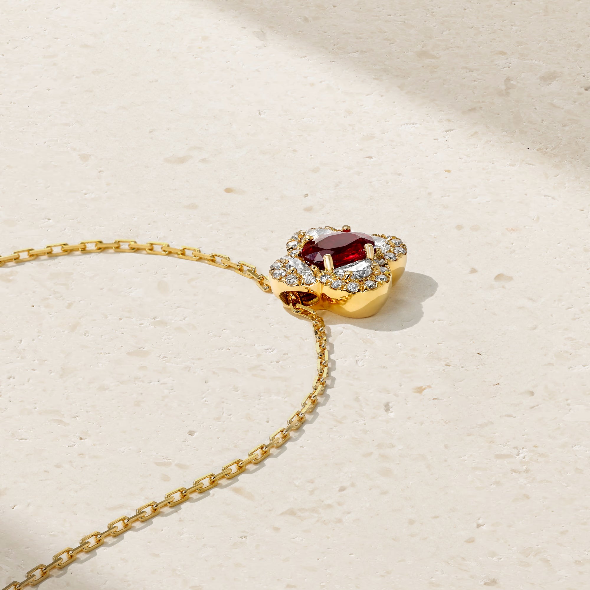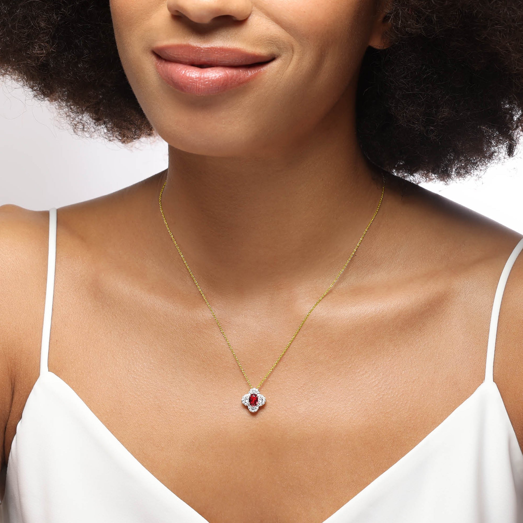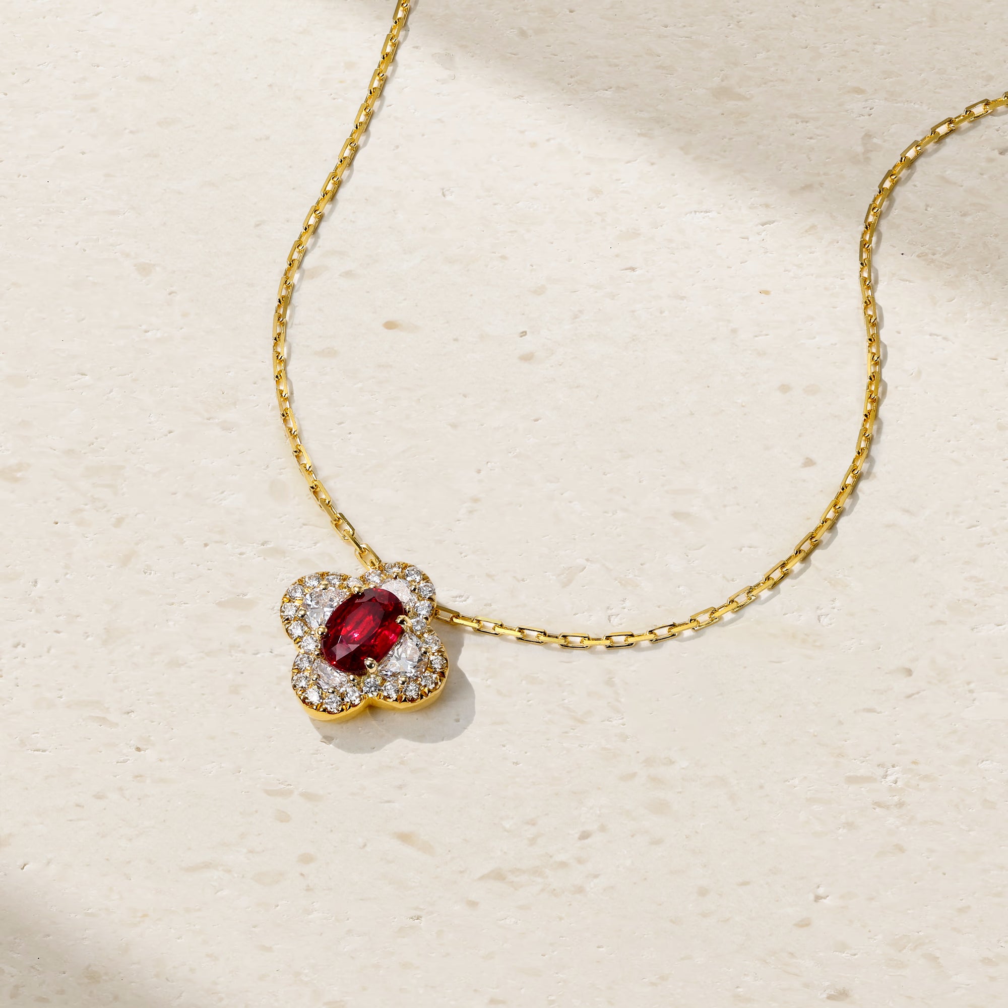 An impressive, vibrant ruby sits at the helm of this masterfully designed pendant. Four, specially cut half moon shaped diamonds are set at the north, south, east and west points of the center stone and are traced by a halo of petite diamonds. It is suspended from a dainty 18" cable link chain. Whether it may be a gift to yourself or a loved one this jewel is a unique addition to any jewelry wardrobe.