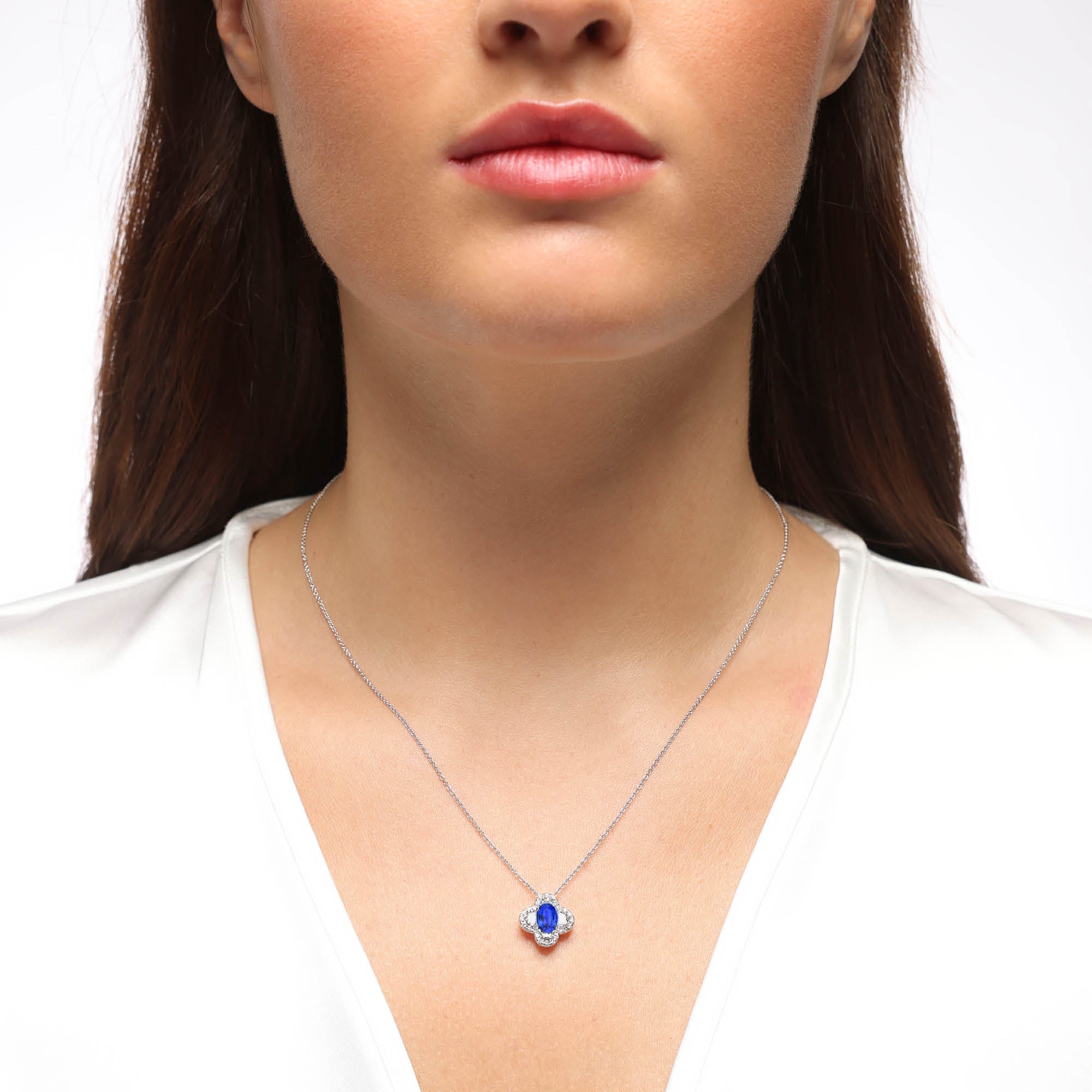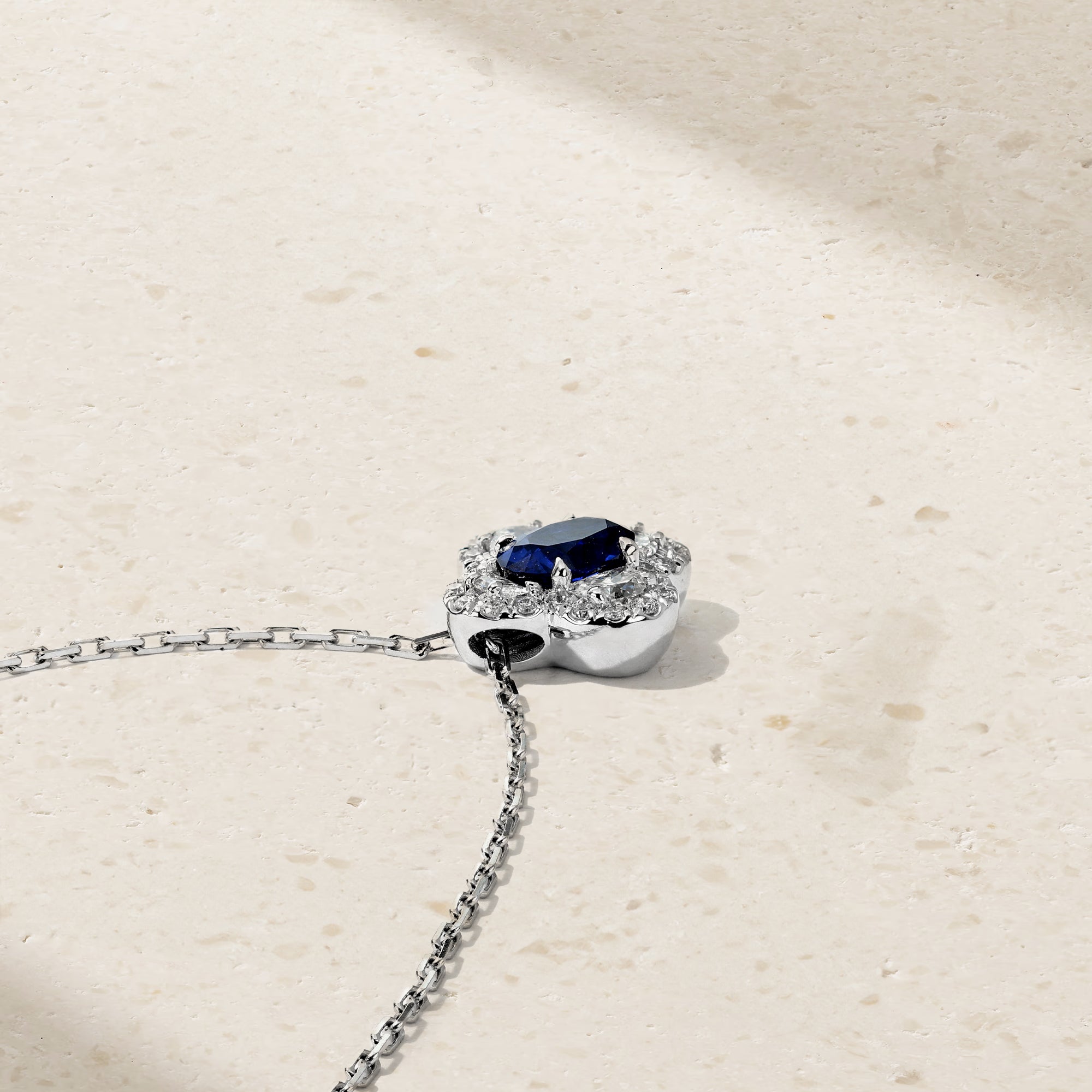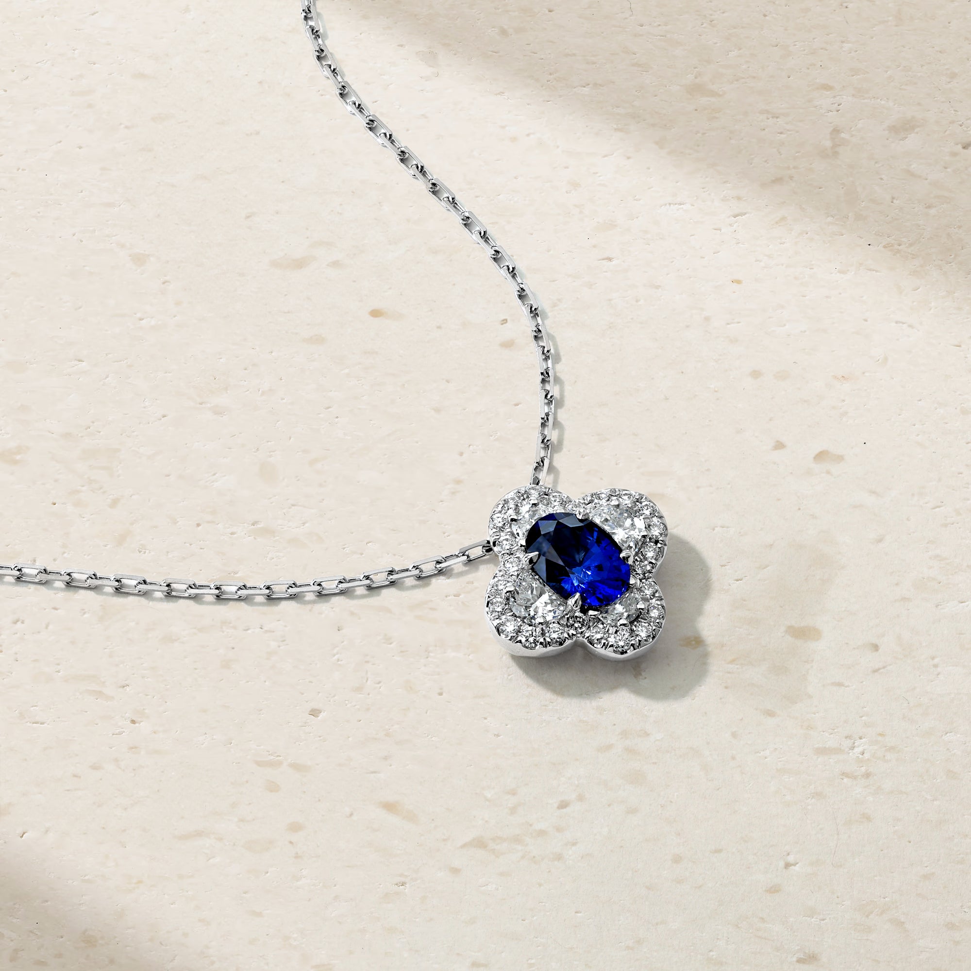 An impressive, brilliant sapphire sits at the helm of this masterfully designed pendant. Four, specially cut half moon shaped diamonds are set at the north, south, east and west points of the center stone and are traced by a halo of petite diamonds. It is suspended from a dainty 18" cable link chain. Whether it may be a gift to yourself or a loved one this jewel is a unique addition to any jewelry wardrobe.