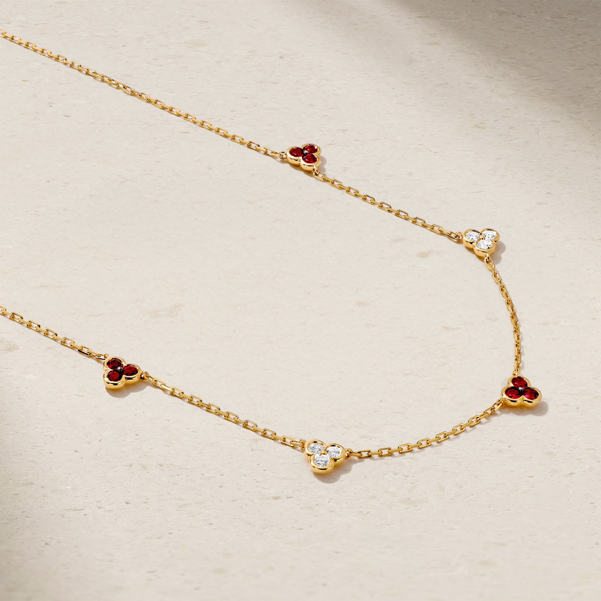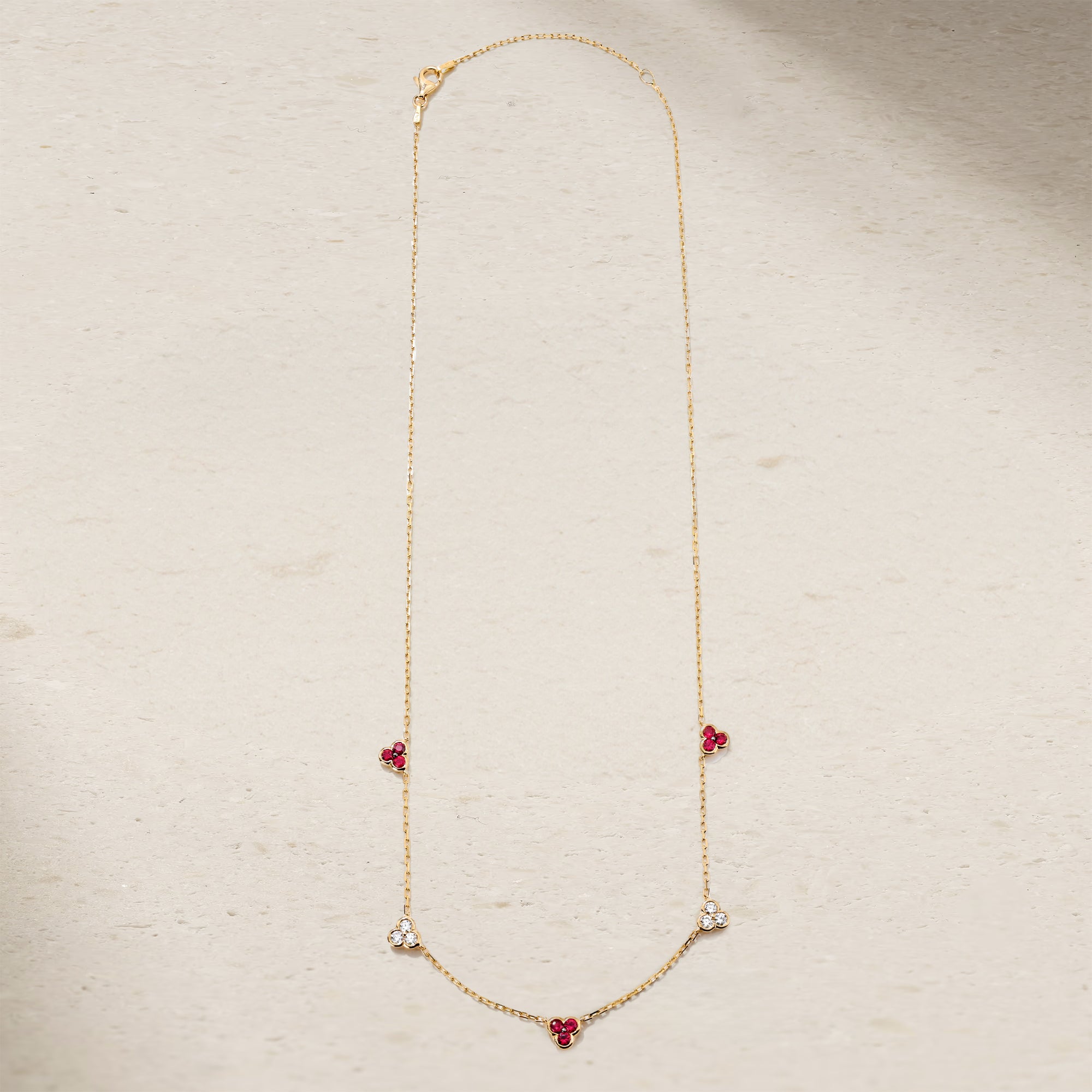 Trios of rubies and diamonds are set within sleek and contemporary half bezel settings as they're interspersed along the front half of a cable link chain. It lends an understated yet elegant look that's ideal for everyday wear. While beautiful on its own, the chain adjusts to 16 and 18 inch lengths so that you can layer it with a variety of different length styles.